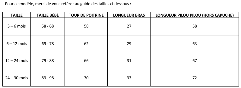 Note : Pour ce modèle, merci de vous référer au guide des tailles situé sur la dernière image.